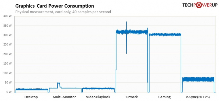 Em termos de consumo de energia, aqui a GeForce RTX 4080 teve um desempenho melhor do que o carro-chefe GeForce RTX 4090. Para a versão de referência da GeForce RTX 4080 Founders Edition, é declarado um consumo de energia de 320 W, mas sob carga a placa consome apenas cerca de 300 W tanto em jogos quanto em testes de estresse. Isso é visivelmente menor do que a GeForce RTX 3080 consome nos mesmos cenários. O pico de consumo de energia, de acordo com o TechPowerUp, atingiu 371 watts.