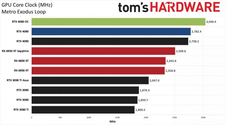 Observe que o Hardware do Tom conseguiu fazer com que a GPU da placa GeForce RTX 4080 funcionasse de forma estável a 3039,4 MHz, e ao mesmo tempo o consumo foi de 307,9 watts. No entanto, isso é em jogos, enquanto no FurMark a frequência estável durante o overclock foi de 2621,5 MHz, enquanto o consumo aumentou para 332,1 watts. Como os revisores observaram, a novidade é altamente eficiente, proporcionando um alto FPS por watt de energia consumida.