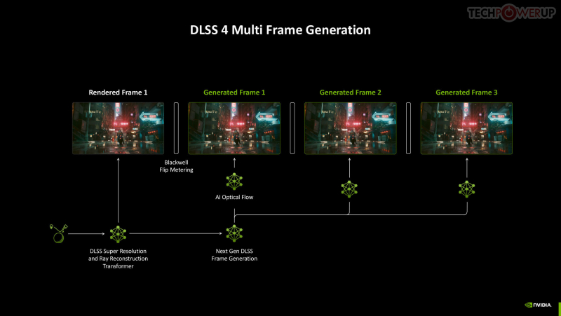 Desde a sua estreia em 2018, a tecnologia de escalonamento de aprendizagem profunda (DLSS) da Nvidia evoluiu para a sua quarta versão. Sua última iteração mudou para um modelo de IA do tipo transformador, que possibilitou a implementação de uma série de novas funções, incluindo geração de múltiplos quadros (MFG). Este último permite criar até três quadros adicionais para cada quadro renderizado tradicionalmente para aumentar o FPS. O MFG é exclusivo para placas de vídeo da geração Blackwell, assim como o gerador de quadros de primeira geração para placas de vídeo da série GeForce RTX 40. Falar mais detalhadamente sobre essa tecnologia exigiria um artigo separado. Aqui apenas notamos que, no momento, o suporte nativo para esta função está implementado em apenas cinco jogos. Um deles é Cyberpunk 2077.
