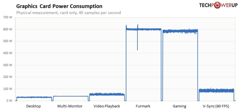 Faz sentido falar sobre o consumo de energia de uma placa de vídeo que custa mais de US$ 2.000 e tem um TDP declarado de 575 W? É improvável que o público-alvo deste produto preste atenção a tal “ninharia”. Porém, a carta consome todo o poder declarado nos jogos. Em alguns casos, o consumo de energia é ainda maior, com picos chegando a 644 W (dados do TechPowerUp). No modo inativo, o consumo de energia da placa é de 30 W com um monitor e 39 W com dois monitores. A reprodução de vídeo requer 54 watts. Em jogos, o consumo de energia é de cerca de 587 W (561 W com RT habilitado). O consumo máximo de energia de acordo com os testes TechPowerUp foi de 601 W. Estamos falando apenas da placa de vídeo, sem levar em conta o consumo do processador, placa-mãe e demais elementos do PC.