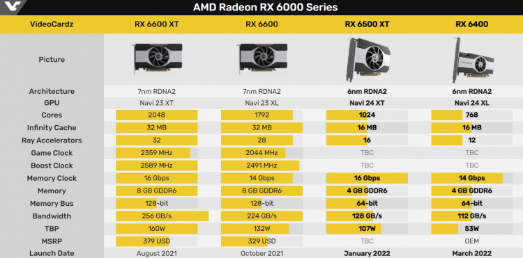 As GPUs Radeon RX 6500 XT e Radeon RX 6400 serão as primeiras GPUs de 6 nm do mercado. É o que diz o portal VideoCardz, referindo-se às suas fontes.