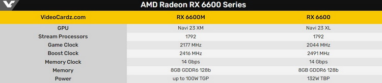 A Radeon RX 6600M móvel usa o mesmo chip gráfico Navi 23 com processadores stream 1792 como a variante desktop atual. As frequências da GPU também são muito semelhantes – ambas operam na faixa de 2,4-2,5 GHz. Mesmo nas configurações de TDP das placas de vídeo, não há diferença significativa. Para a versão móvel, o nível de consumo de energia é de até 100 watts e para versões reais de desktop – até 132 watts. A quantidade de memória para placas de vídeo também é a mesma – 8 GB GDDR6 com suporte para um barramento de 128 bits e um indicador de frequência efetivo de 14 GHz (14 Gb / s). Portanto, toda a diferença se resume a uma pequena modificação do BIOS.