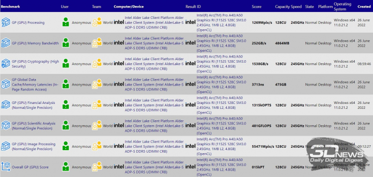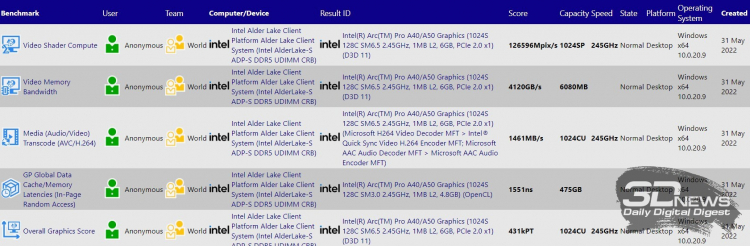 No banco de dados de teste sintético SiSoftware Sandra, foram observados os aceleradores gráficos profissionais Intel Arc Pro A40 e Arc Pro A50. É curioso que ambas as placas de vídeo sejam exibidas lá com um único nome, o que sugere a semelhança de suas características, ou o software ainda não aprendeu a identificá-las e distingui-las corretamente uma da outra.