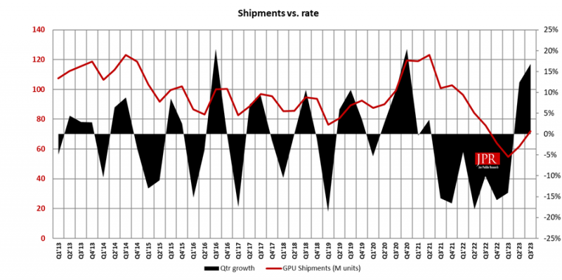 Como observa Jon Peddie Research, o terceiro trimestre normalmente apresenta o crescimento mais forte nas remessas de GPU. Este ano, as remessas do terceiro trimestre não só aumentaram 16,8% em relação ao trimestre anterior, mas o crescimento foi quase o dobro da média de 10 anos de 8,8%.
