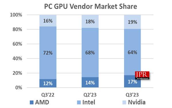 As remessas de processadores gráficos para PCs no terceiro trimestre de 2023 aumentaram 16,8% em relação ao trimestre anterior e atingiram 71,9 milhões de unidades, segundo analistas da Jon Peddie Research. Ao mesmo tempo, as remessas de CPU caíram 5,1% ano a ano, o maior declínio em cinco anos.