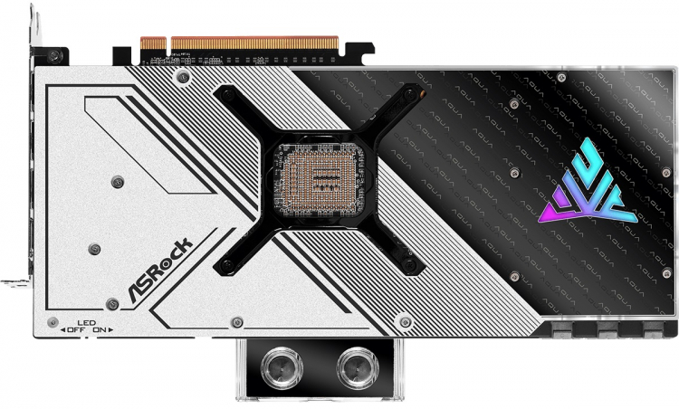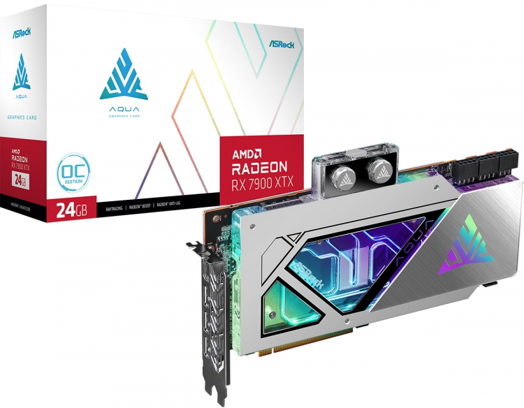 A mais velha entre as novidades é a ASRock Radeon RX 7900 XTX Aqua OC, que é diferente de enquadramento водоблоком para se conectar a кастомной sistema de refrigeração líquida. Fabricante observa que a novidade usa водоблок completa cobertura sobre a nova arquitetura de Jet Microchannel Engine, характеризирующийся usando os microcanais para o refrigerante largura de 0,3 мм.