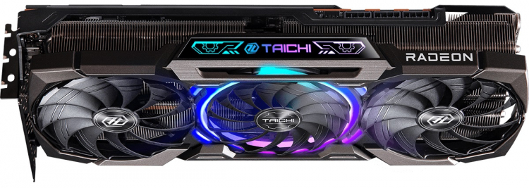 Modelos de placas gráficas Radeon RX 7900 XTX Taichi OC e Radeon RX 7900 XT Taichi OC usam o enorme fluxo de ar do sistema de refrigeração, compostos por três ventiladores. Dois laterais têm um diâmetro de 110 mm, o diâmetro central é de 100 мм. Espessura de ambas as placas de vídeo é de 3 slots de expansão. Dimensões de cada novidade são iguais 345 × 140 × 61 мм.