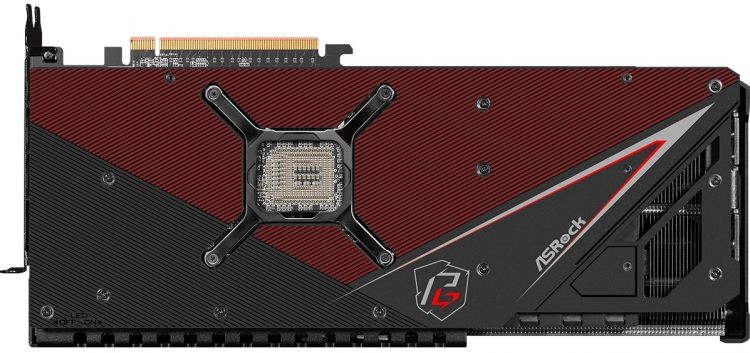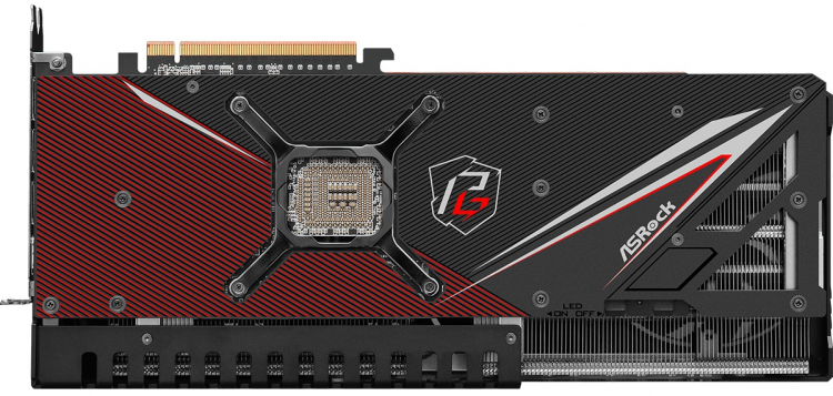 O acelerador Radeon RX 7900 XTX Aqua OC equipado posterior amplificação de placa de acrílico e alumínio, bem como ARGB led, que pode sincronizar com iluminação de placas-mãe ASRock, que suportam a marca de um aplicativo para controle de iluminação Polychrome SYNC.