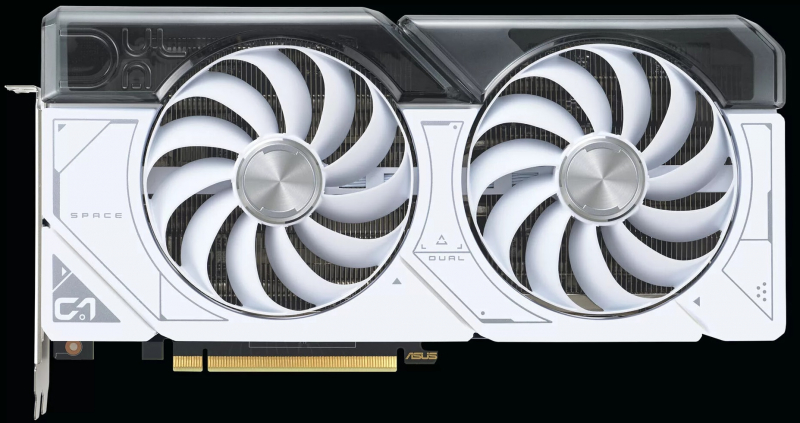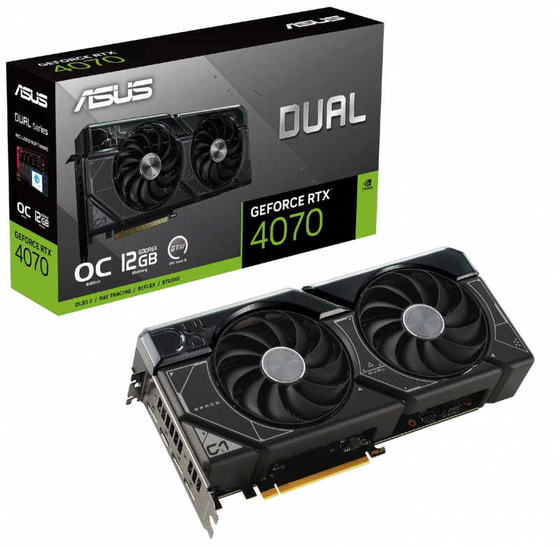 O modelo ASUS GeForce RTX 4070 Dual será lançado em quatro versões ao mesmo tempo – nas cores branco e preto, cada uma com overclock de fábrica e sem ela. Para o modelo Dual, a fabricante desenvolveu um novo sistema de refrigeração com duas ventoinhas. As dimensões da placa de vídeo são 267,01 × 133,94 × 51,13 mm. Ocupa 2,5 slots de expansão.