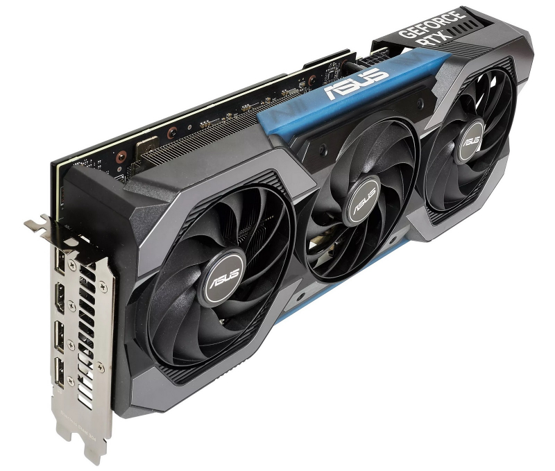 O acelerador recebe energia adicional por meio de um conector de 8 pinos. A placa de vídeo está equipada com três saídas de vídeo DisplayPort 1.4 e uma HDMI 2.1.