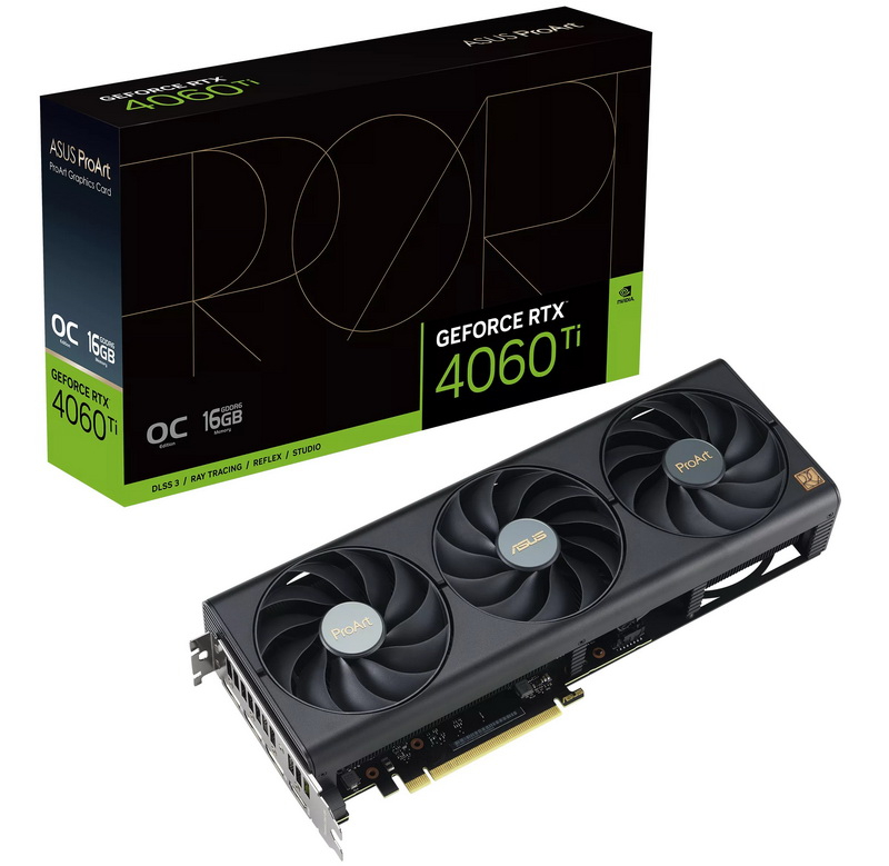 As placas de vídeo ASUS ProArt GeForce RTX 4060 Ti de 16 GB oferecem overclock de GPU de fábrica até 6% acima da frequência de referência declarada da NVIDIA. Os modos de overclocking são ativados através do aplicativo proprietário ASUS GPU Tweak. As placas são equipadas com um sistema de BIOS duplo com modos silencioso e de desempenho.