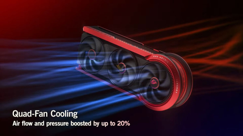 O sistema de resfriamento da placa de vídeo da Asus inclui quatro ventoinhas, assim como os modelos ROG Astral da mesma empresa. Todas as ventoinhas suportam a função de parada completa com carga mínima na GPU.
