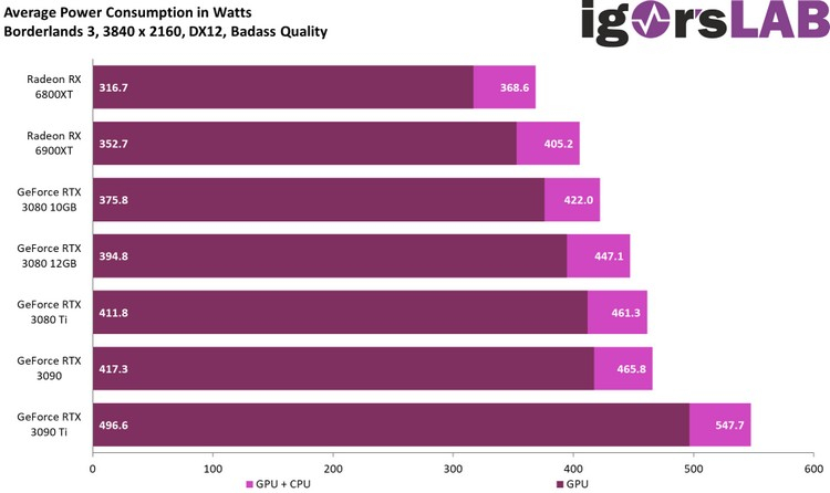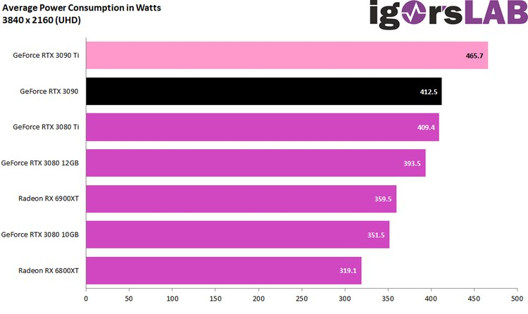 Nos testes do Igor’s Lab, a MSI GeForce RTX 3090 Ti Suprim X apresentou valores de consumo de energia semelhantes – um máximo de 496,6 W e um consumo médio de 465,7 W em 4K.