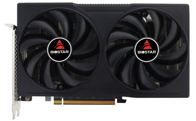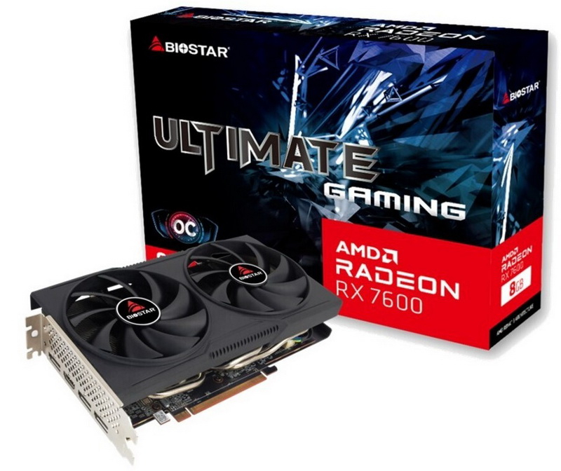 A espessura do Biostar Radeon RX 7600 OC é de dois slots de expansão. Está equipado com um sistema de refrigeração relativamente compacto, que inclui dois ventiladores.