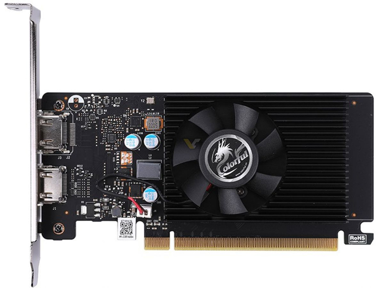 O acelerador gráfico colorido GeForce GT 1010 tem um design de slot único. Existem duas portas HDMI para conectar monitores.