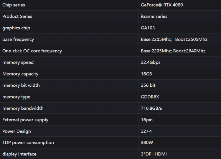 O acelerador colorido GeForce RTX 4080 iGame Neptune está equipado com um subsistema de energia de 26 fases aprimorado. A empresa confirmou que a novidade recebeu um sistema de BIOS duplo com capacidade de alternar rapidamente entre os modos de operação. Com o clique de um botão, a frequência máxima do processador gráfico NVIDIA AD103 pode ser aumentada de 2505 para 2640 MHz. Neste caso, a frequência base em ambos os casos permanecerá a mesma e será de 2205 MHz.