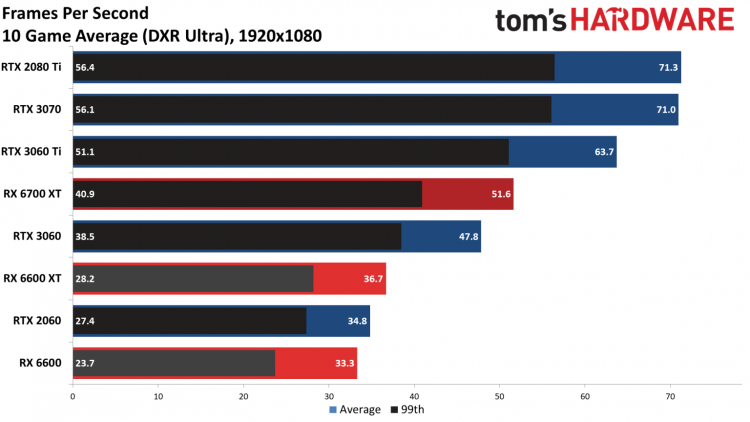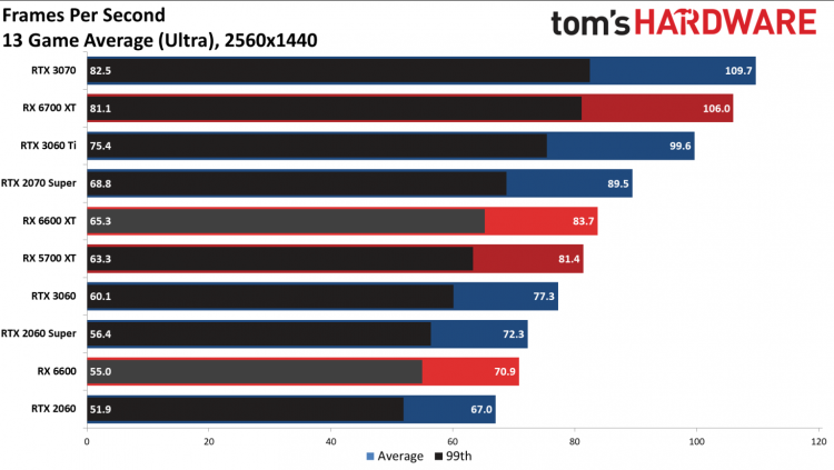 Além disso, o Radeon RX 6600 foi testado a 1440p e basicamente mostrou um nível de desempenho bastante aceitável. O FPS médio em 13 jogos de acordo com Tom’s Hardware foi de 70,9 frames por segundo. Mesmo com Cyberpunk 2077, ela conseguiu superar os estimados 30 FPS, embora sem traçado de raio.