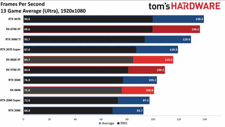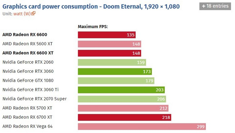 Finalmente, com relação ao consumo de energia: em jogos, o Radeon RX 6600 consome quase o mesmo que a AMD afirma – 135-137 watts de acordo com vários analistas. Isso é significativamente menor do que o consumo da GeForce RTX 3060 (acima de 170W). Acontece que o novo produto da AMD supera significativamente seu concorrente em termos de eficiência por FPS. Em cerca de 15-20%.