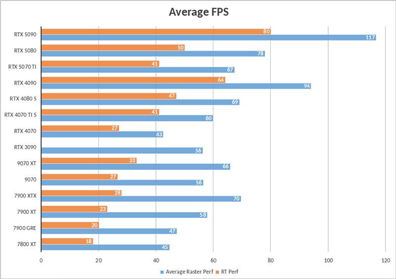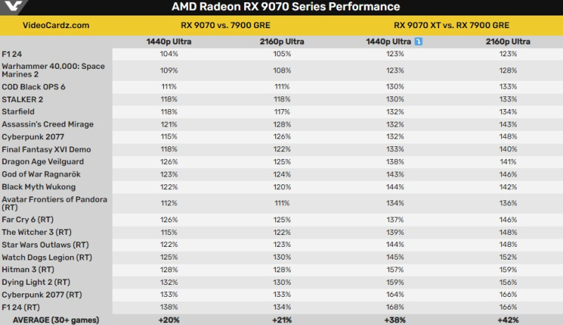 Abaixo está uma tabela mostrando as diferenças de desempenho entre as novas placas em jogos sem ray tracing e com ray tracing em comparação com a RX 7900 GRE. Ao contrário da Nvidia, a AMD concentra seus testes no desempenho puro (raster) e RT, em vez de no desempenho com geradores de quadros ou upscalers.
