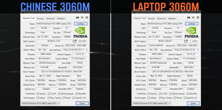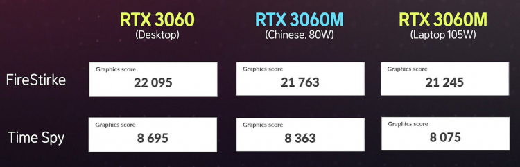 Em uma versão móvel normal da GeForce RTX 3060, o TDP pode chegar a 115 watts (dependendo do fabricante de um laptop em particular), enquanto a GeForce RTX 3060 de mesa consome no máximo 170 watts. Por sua vez, o consumo máximo de energia da versão híbrida “chinesa” é de 80 watts. Apesar disso, segundo o avaliador, a placa de vídeo apresenta desempenho superior em relação à versão de 105 watts da GeForce RTX 3060 móvel.
