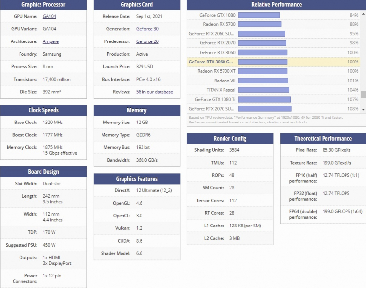 Como afirmado acima, a GeForce RTX 3060 original é baseada na GPU GA106. No entanto, a nova variante usa o chip GA104, que é comumente encontrado em modelos como a GeForce RTX 3060 Ti, GeForce RTX 3070 e GeForce RTX 3070 Ti. Lembre-se de que a área do processador GA106 é de 276 mm2, ele contém 13,25 bilhões de transistores. O chip GA104 é maior – com uma área de 392 mm2, ele contém 17,4 bilhões de transistores.