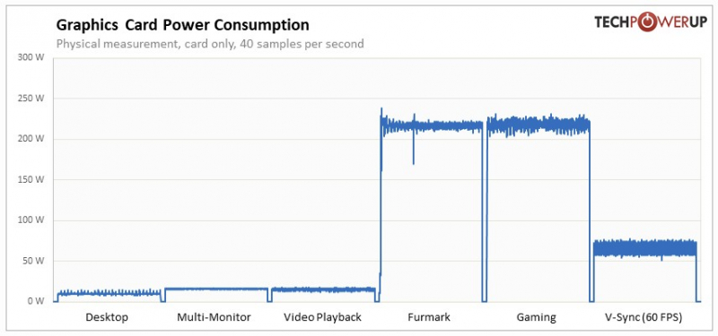 Quanto ao consumo de energia, em jogos o novo produto na versão de referência da NVIDIA consumiu até 218 W de potência. O consumo de energia de pico (rajadas curtas a 20 ms) foi de 239 W. Quando inativa, a placa consome 10 W de energia e ao conectar dois monitores – 16 W.