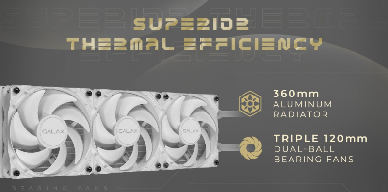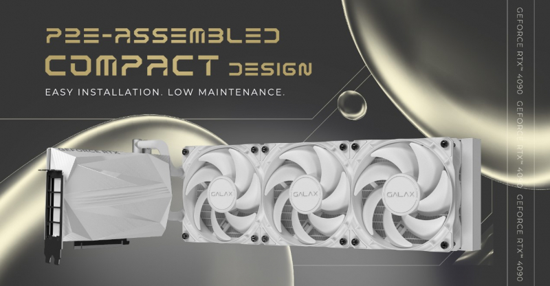 A GeForce RTX 4090 Hydro White possui um sistema de refrigeração líquida livre de manutenção com um radiador externo de 360 mm com três ventoinhas de rolamento de esferas de 120 mm. Embora um dissipador de calor externo seja responsável pelo resfriamento, a placa em si tem dimensões impressionantes, pois tem 15 cm de largura, em vez dos 13,5 cm padrão. Provavelmente, o motivo de um design tão maciço é o design individual da placa GALAX .