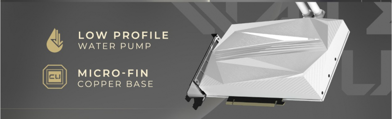 Este modelo possui uma placa traseira de liga de alumínio e não há ventoinhas na própria placa. A bomba de água de baixo perfil está escondida sob uma cobertura poligonal e praticamente não há saídas de ar em nenhum lugar da placa. Um bloco de água de cobre será responsável por dissipar o calor da GPU, memória de vídeo e baterias.