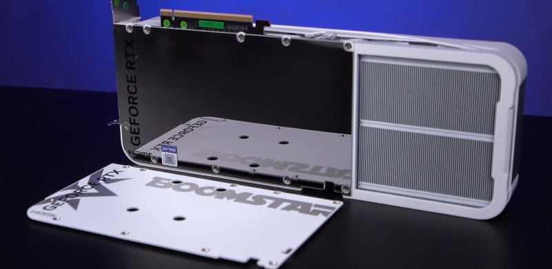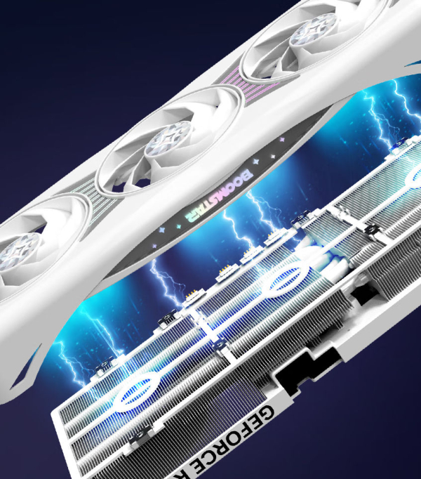 O logotipo da Boomstar na parte superior da placa é retroiluminado, o que tem uma função prática: alertar o usuário se o cabo de alimentação 12V-2×6 12+4 pinos não estiver conectado firmemente. A retroiluminação muda de cor para indicar um problema.
