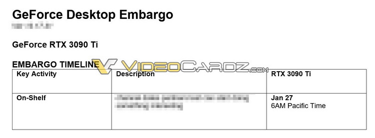 A fonte destaca que para cada data relacionada ao anúncio de aceleradores, envio de amostras de placas de vídeo, publicação de reviews e seu lançamento, a NVIDIA costuma enviar documentos separados para seus parceiros. O documento citado pela VideoCardz contém, em particular, a data de chegada da placa de vídeo GeForce RTX 3090 Ti com 24 GB de memória à venda – 27 de janeiro.