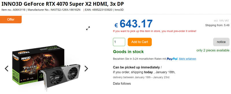Os preços da GeForce RTX 4070 Super também estão sendo reduzidos em outros países. Na Áustria, o custo recomendado da placa de vídeo é de 659€. No entanto, a loja DiTech reduziu o preço em 4,6% e oferece a versão mais acessível do novo produto por 629€. Em algumas lojas na Alemanha, o cartão pode ser adquirido em vez dos 649 euros recomendados por 643 euros (3% de desconto).