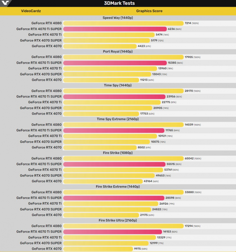 Revisores independentes estão concluindo os testes da GeForce RTX 4070 Ti Super e publicarão os resultados nos próximos dias. Um desses revisores compartilhou anonimamente informações sobre o desempenho da placa em testes sintéticos 3DMark com o portal VideoCardz. Acontece que o novo RTX 4070 Ti Super é 8% mais rápido que o RTX 4070 Ti normal e também 15% mais lento que o RTX 4080. A diferença de desempenho com a próxima GeForce RTX 4080 Super será ainda mais significativa. Lembramos que o RTX 4070 Ti Super e o RTX 4080 Super substituirão completamente os modelos originais à venda.