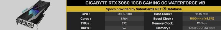 Um recurso adicional da variante Gaming WaterForce WB é a ausência de um sistema de detecção de vazamento (um recurso exclusivo da série premium Aorus). O processador gráfico da placa de vídeo vem com overclock de fábrica. O fabricante afirma uma frequência GPU de 1800 MHz no modo Boost, que é 45 MHz menor que a versão Aorus, mas 5,3% maior que a frequência nominal declarada pela NVIDIA.