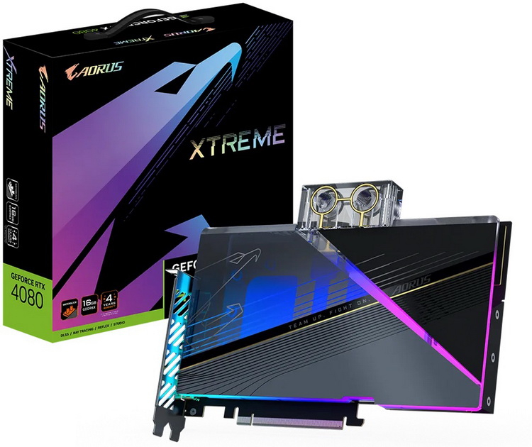 Um recurso importante da Aorus GeForce RTX 4080 Xtreme Waterforce é um sistema de refrigeração líquida livre de manutenção com um radiador externo de 360 mm. É resfriado por três ventoinhas ARGB de 120 mm. O comprimento das mangueiras que conectam o bloco de água LSS ao radiador é de 460 mm. Como o modelo Aorus GeForce RTX 4080 Xtreme Waterforce WB, a GPU Aorus GeForce RTX 4080 Xtreme Waterforce funciona a 2565 MHz. As dimensões do acelerador (excluindo o radiador) são 236 × 146 × 40 mm.