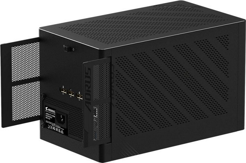 As dimensões da Aorus GeForce RTX 4090 Gaming Box são 189 × 302 × 172 mm. A placa gráfica externa está equipada com uma fonte de alimentação de 850 W. O fabricante reivindica a certificação 80 Plus Gold para ele, indicando uma alta eficiência sob carga (acima de 90%).