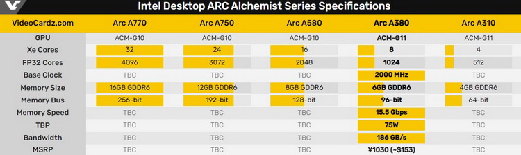 A Intel alterou a lista de especificações do acelerador gráfico de desktop Arc A380. Agora o fabricante indica que a placa de vídeo está equipada com memória GDDR6 com velocidade de 15,5 Gb/s por pino, enquanto antes era de cerca de 16 Gb/s. Isso significa que a largura de banda de todo o subsistema de memória não é de 192 GB / s, mas de 186 GB / s. A empresa não fez outras alterações nas características do cartão.