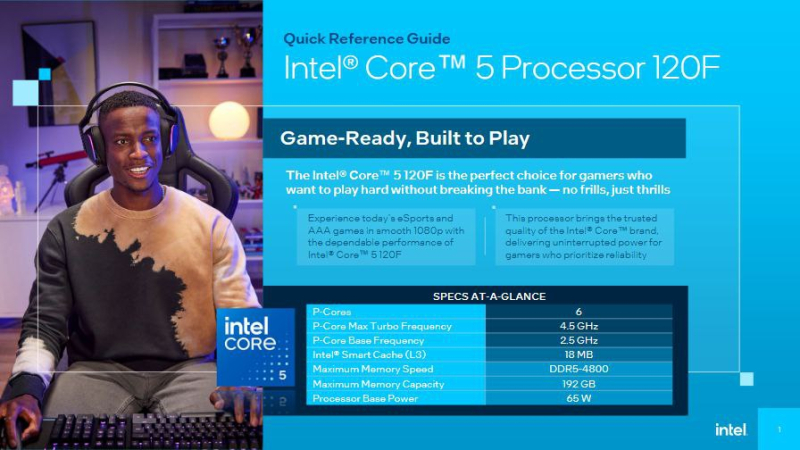 De acordo com o slide promocional, o Core 5 120F tem uma frequência base de 2,5 GHz e uma frequência máxima de 4,5 GHz. O processador possui 18 MB de cache L3, suporta até 192 GB de memória DDR5-4800 e tem um consumo nominal de energia de 65 watts. As especificações do processador são muito semelhantes às do Core i5-12400F, que também possui apenas núcleos P. A diferença entre os chips é a velocidade do clock, que é 100 MHz maior no Core 5 120F.