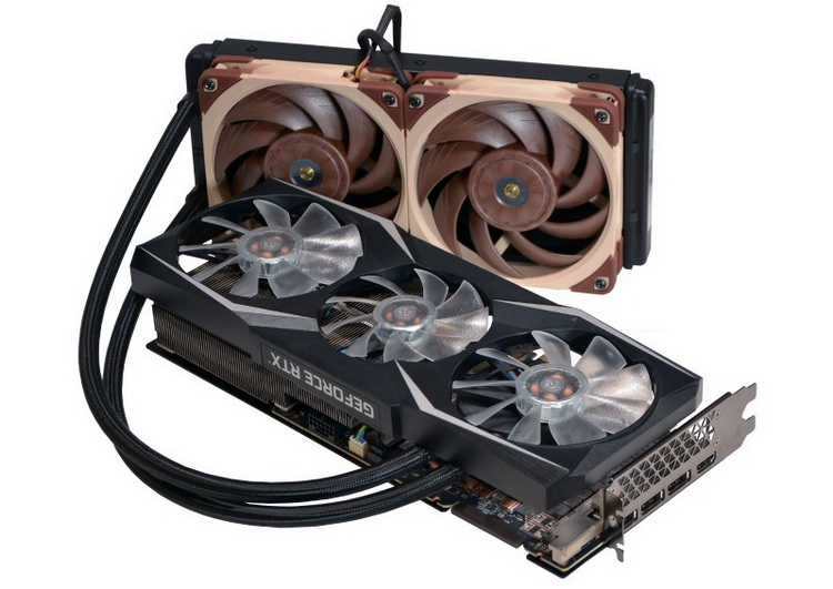 A própria placa de vídeo GeForce RTX 3090 Ti G-Master Hydro está equipada com três ventoinhas. Dois adicionais são usados para resfriar o cooler Asetek Hybrid GFX 240mm, que fornece resfriamento para o processador gráfico da placa de vídeo e chips de memória. O dissipador de calor é soprado por um par de ventoinhas Noctua NF-A12X12 ULN de 120 mm funcionando a 1200 rpm. Cada um deles fornece um fluxo de ar de 55,7 metros cúbicos por hora. Ao mesmo tempo, seu nível de ruído não excede 12,1 dBa.