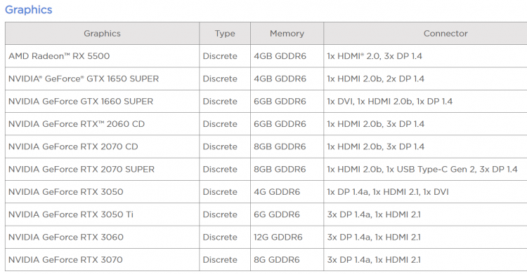 De acordo com o fabricante, o modelo GeForce RTX 3050 vem equipado com 4 GB de memória de vídeo GDDR6. As especificações da placa gráfica não são fornecidas; os dados da Lenovo contêm informações sobre o conjunto de interfaces disponíveis no acelerador gráfico. Inclui um DisplayPort 1.4a, um HDMI 2.1 e um DVI. O modelo GeForce RTX 3050 de acordo com o fabricante está equipado com 6 GB de memória GDDR6, além de três DisplayPort 1.4ae um HDMI 2.1. Quanto à GeForce RTX 3060, a Lenovo credita ao modelo 12 GB de memória de vídeo GDDR6, bem como três DisplayPort 1.4ae um HDMI 2.1.