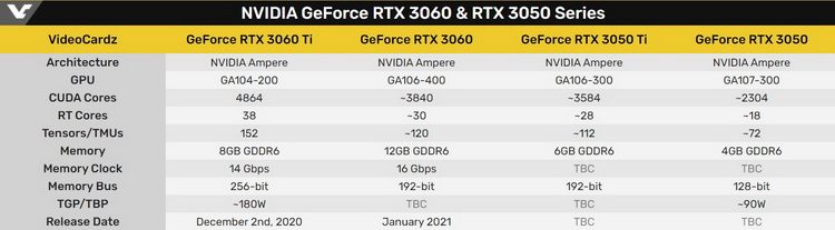 Como o recurso VideoCardz aponta, os modelos GeForce RTX 3060 e RTX 3050 Ti são baseados na GPU GA106. Segundo rumores, no primeiro caso, o chip tem 3840 núcleos CUDA a bordo, no segundo – 3584. O modelo mais jovem da GeForce RTX 3050, segundo os mesmos rumores, é baseado no processador gráfico GA107, que é equipado com 2304 núcleos CUDA.