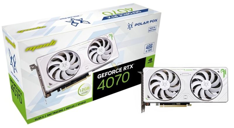 A fabricante também apresentou modelos GeForce RTX 4070 Polar Fox na cor branca, equipados com sistemas de refrigeração com duas e três ventoinhas. Todos os novos produtos apresentados não possuem GPU com overclock de fábrica. Consequentemente, sua GPU opera na faixa de frequência de referência de 1920 a 2475 MHz.