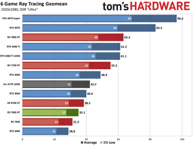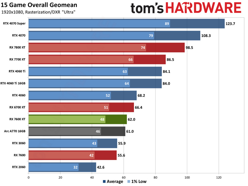 Se você não levar em conta os jogos com ray tracing, o novo produto da AMD acaba sendo mais rápido que a GeForce RTX 4060, mas ainda fica aquém da Radeon RX 6700 XT. E olhando os testes de ray tracing separadamente, fica claro que a Radeon RX 7600 XT perde para a GeForce RTX 3060 e Intel Arc 770.