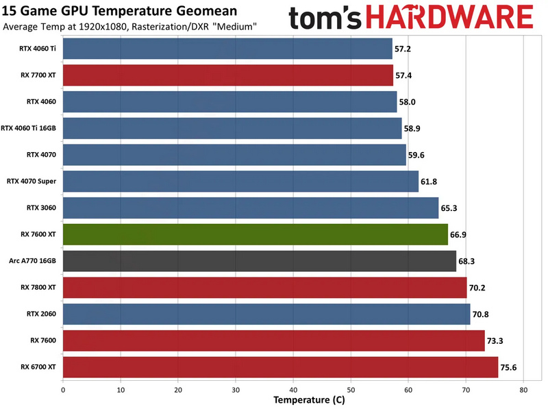 A Radeon RX 7600 XT acabou consumindo mais energia do que a Radeon RX 7600, mas menos barulhenta e não apenas mais quente, embora isso provavelmente se deva a coolers não padrão. No caso da Sapphire Radeon RX 7600 XT Pulse, a temperatura média da GPU em jogos foi de 66,9°C contra mais de 73°C da referência RX 7600. O nível de ruído sob carga foi de apenas 38 dBA. O consumo médio em jogos foi de 190 W (em 1080p), que é ligeiramente superior ao consumo da muito mais poderosa GeForce RTX 4070 com seus 183 W, e também visivelmente superior aos 154 W de sua irmã Radeon RX 7600.