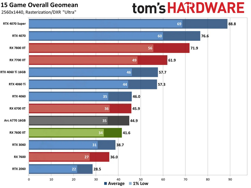O desempenho da Radeon RX 7600 XT é em média 9% superior ao da Radeon RX 7600. E isso é muito impressionante, porque a novidade usa a mesma GPU, cuja frequência é apenas 2-3% maior. Ou seja, o principal aumento é proporcionado justamente pelo aumento da quantidade de memória de vídeo. Mesmo assim, 8 GB nem sempre são suficientes, mas 16 GB já são bons. A Computer Base observa que a Radeon RX 7600 XT é capaz de competir dignamente com a GeForce RTX 4060, implicando a versão de 8 GB desta última. Mesmo o ray tracing não salva este último, porque 8 GB não são suficientes aqui.
