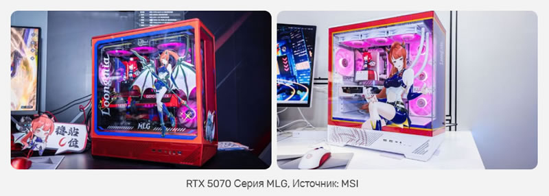 A MSI revelou a nova série de placas de vídeo GeForce RTX 5070 Ti GAMING TRIO como parte de uma série especial da MLG temática da personagem Loong: Nia, também conhecida como a Princesa Dragão da MLG. Os modelos estão disponíveis em duas opções de design: vermelho/preto e vermelho/branco. Junto com eles, foram exibidos PCs gamer prontos para uso, montados com base nessas placas de vídeo e outros componentes temáticos.