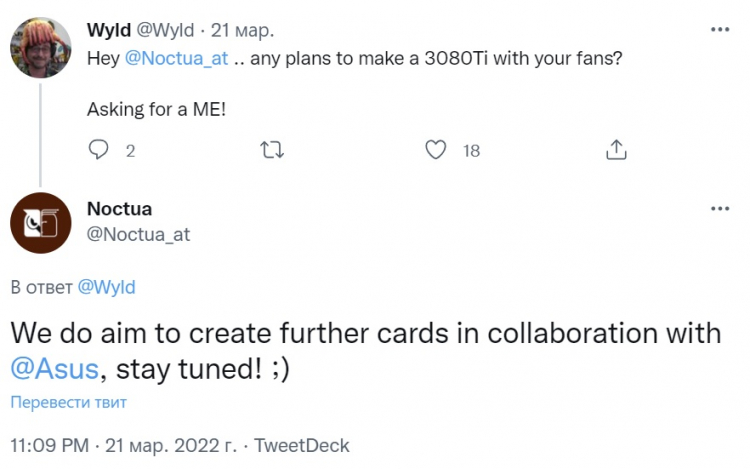 Um dos usuários do Twitter perguntou na página oficial do Noctua no Twitter sobre a possibilidade de lançar um modelo GeForce RTX 3080 Ti Noctua Edition mais potente. Representantes da empresa responderam: “Estamos realmente trabalhando em novos cartões em cooperação com a ASUS. Mantenha para atualizações”.