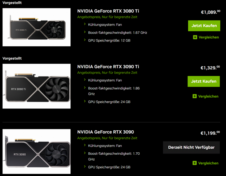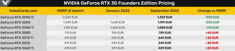 Ao mesmo tempo, o restante dos modelos nas versões de referência, ou seja, as versões GeForce RTX 3080, RTX 3070 Ti, RTX 3070 e RTX 3060 Ti da Founders Edition, ainda são oferecidos pela NVIDIA a um preço mais alto do que o anunciado originalmente. Seus preços são cerca de 5% acima do recomendado.