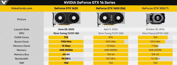 A largura de banda da memória afeta muito o desempenho de uma placa gráfica, especialmente ao usar altas resoluções. Portanto, a GeForce GTX 1630 é muito difícil de chamar de aceleradora de jogos. Aparentemente, a NVIDIA pensa o contrário. De acordo com rumores anteriores, a GeForce GTX 1630 será ainda mais lenta que a GeForce GTX 1050 Ti. A NVIDIA não fornece gráficos oficiais com dados de desempenho.
