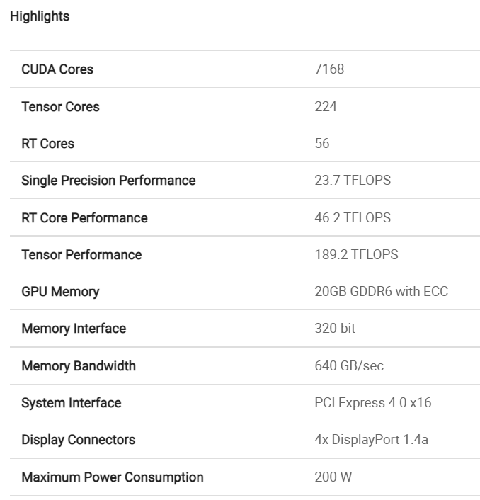 Levando em consideração a taxa de transferência de dados de 16 Gb / s por contato, a largura de banda do subsistema de memória é de 640 GB / s. De acordo com a NVIDIA, o desempenho teórico do acelerador RTX A4500 é de 23,7 teraflops (FP32) ou 46,2 teraflops (FP16).