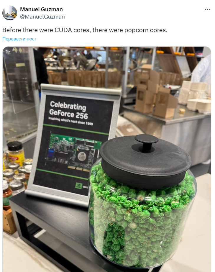 Para marcar o aniversário, Manuel Guzman de Software QA da Nvidia compartilhou uma foto do refeitório da empresa comemorando com pipoca verde, uma homenagem à icônica cor verde associada à marca Nvidia.